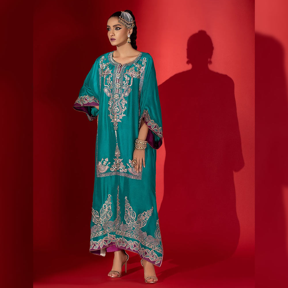Surmai is a glistening eucalyptus green kaftan made with meticulous details and threads. A pure raw silk kaftan shirt and inspired from vintage dori work accentuated with resham and metallic thread embroidery adorned with heavy embelished handmade finishes at neckline curated essentially for your festivities.