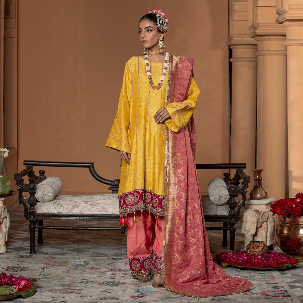 A vibrant take on the seasonal color lime yellow on textured cotton net levitated by hand made dori work and exquisite thread work around the borders .paired with the ever regal shalwar with thread work borders completed with a pink tissue jamawar dupatta.