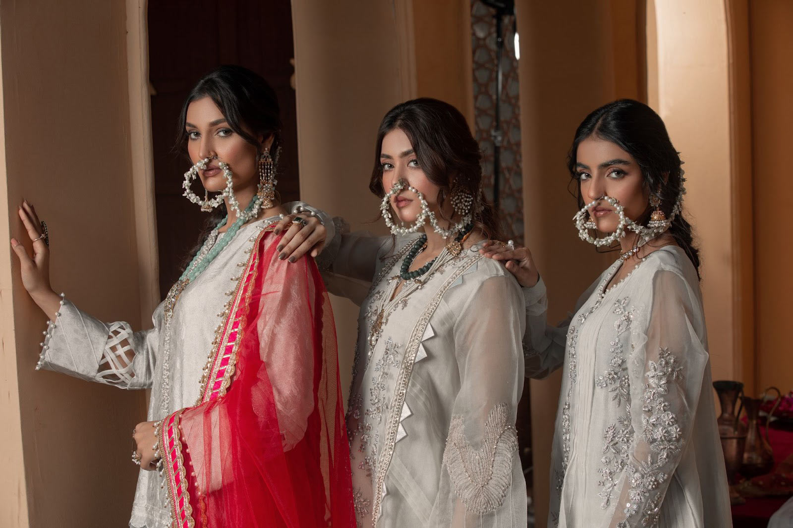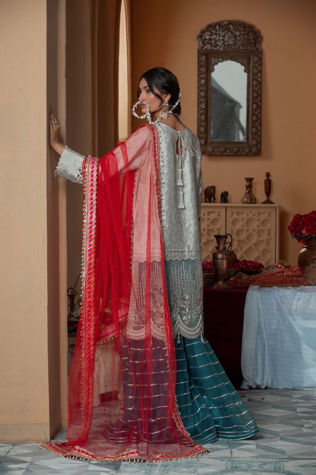 Castle wall: Withering ash white textured tissue silk and organza shirt gilded with complex yet elegant hand work , paired with a teal blue contrasting net sharara finished with lappa borders and a hot pink dupatta with raw silk finishes complimenting the ensemble.