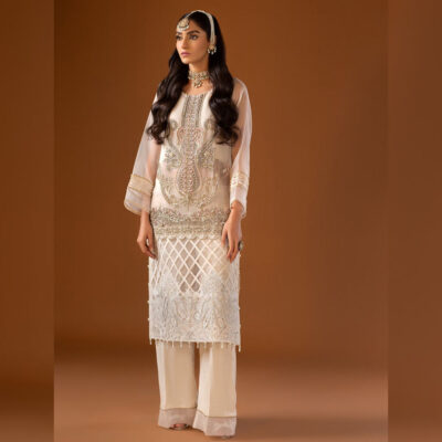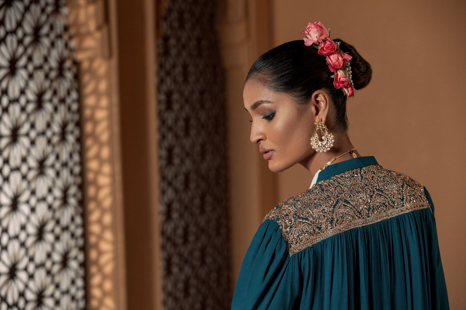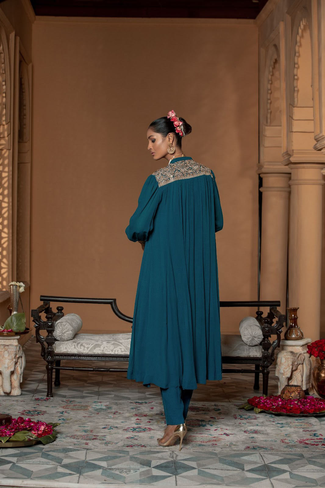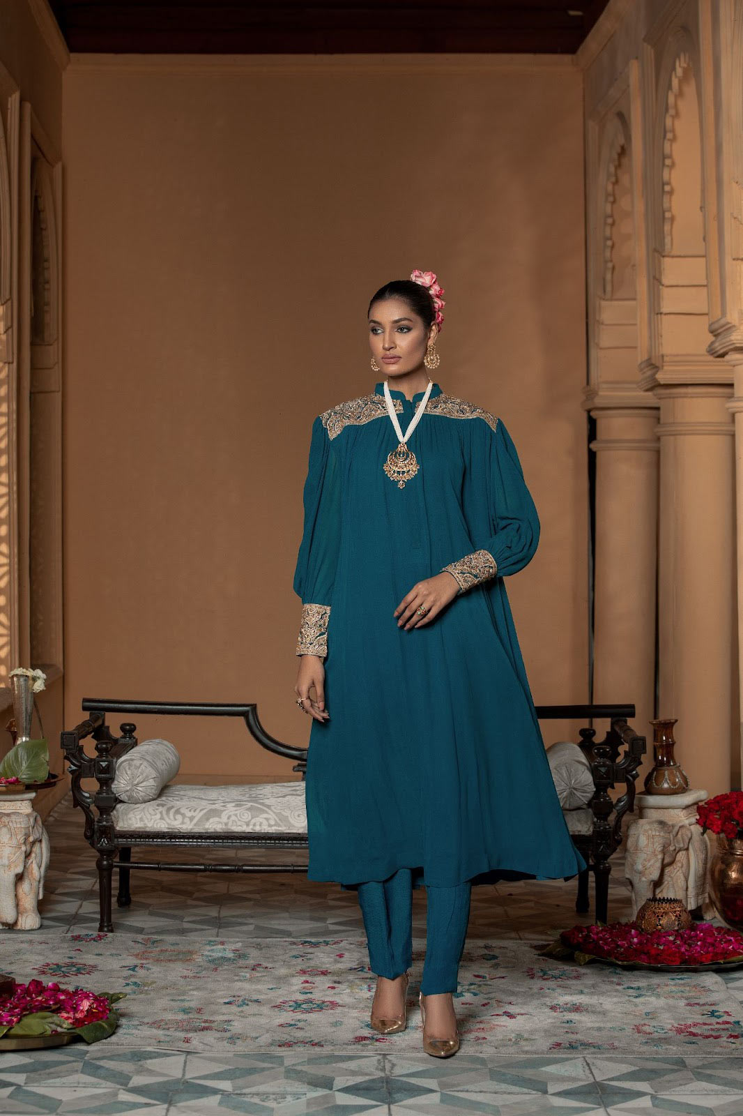 An incredible yet bold and vibrant shade of blue suitable for every occasion , A georgette dress enhanced with gold tilla work on the cuffs and shoulder adorned with glistening crystals and beads adding to delicate attire completed with a raw silk trouser.