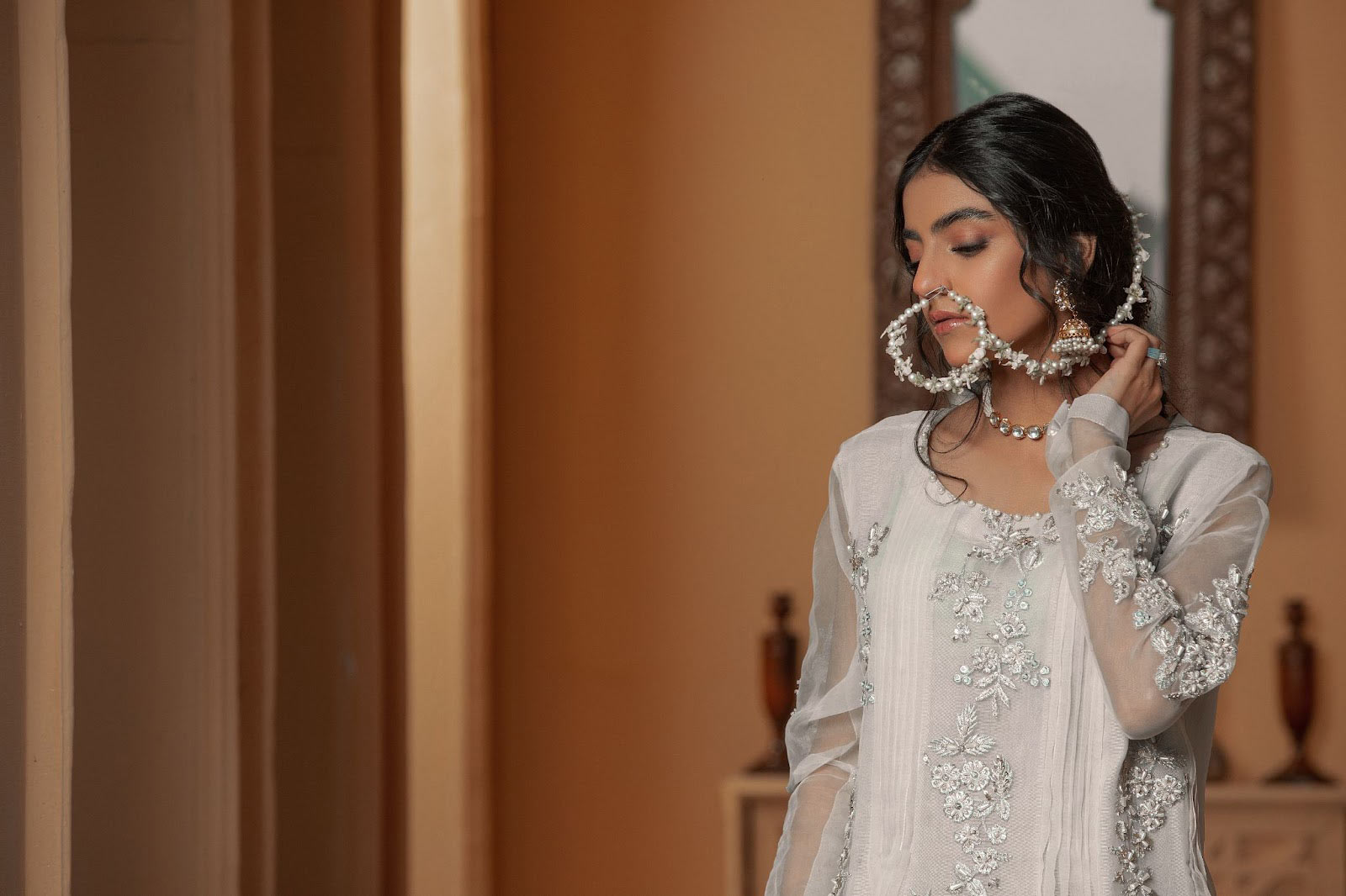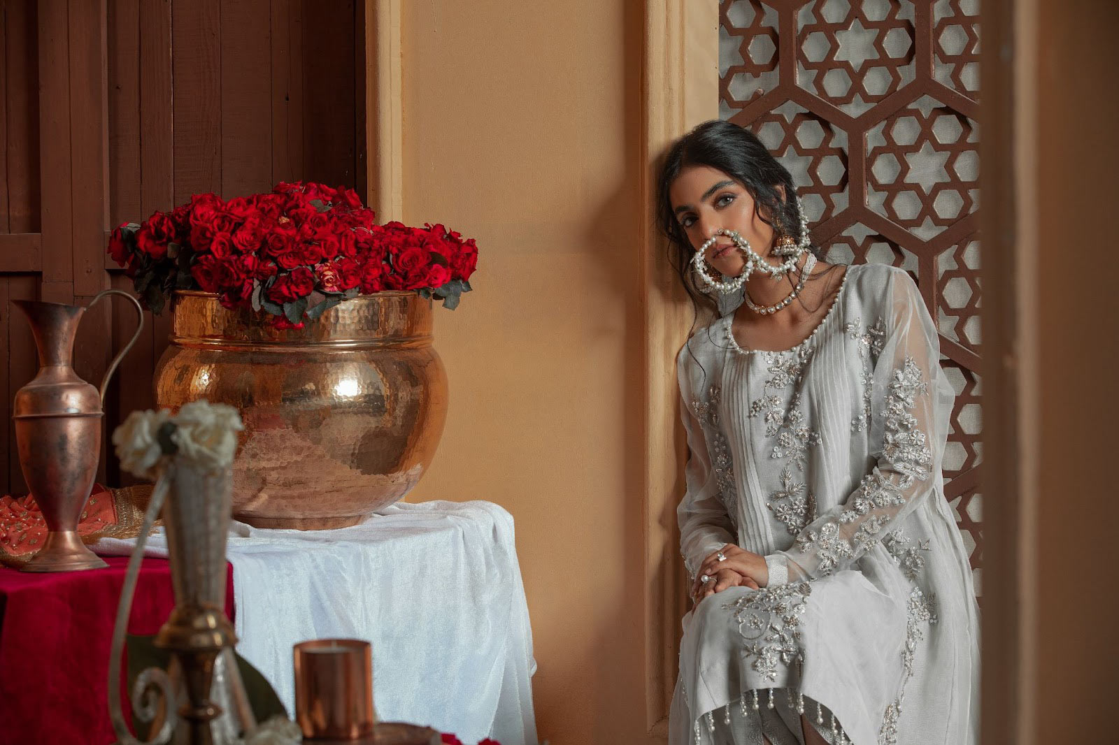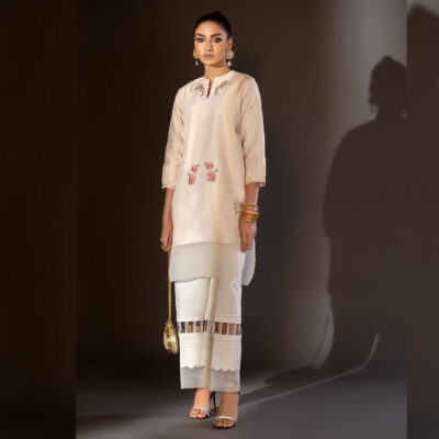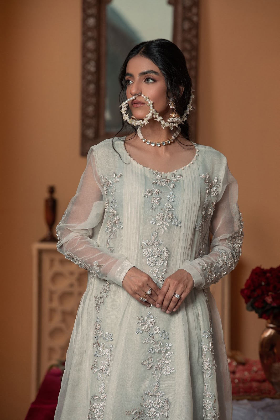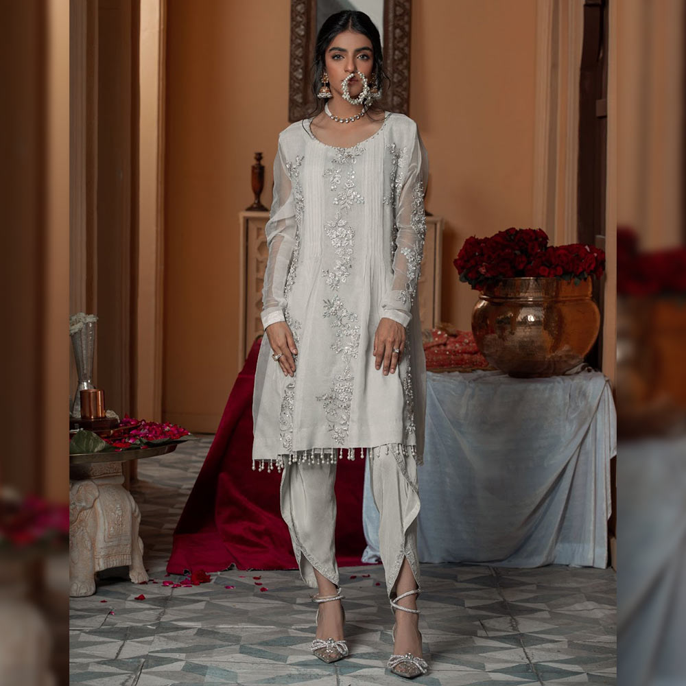 Oriental floral inspired detailed hand work on a delicate moon white peplum shirts paired with a detailed embroidered tulip trouser bringing together a classic chic silhouette.