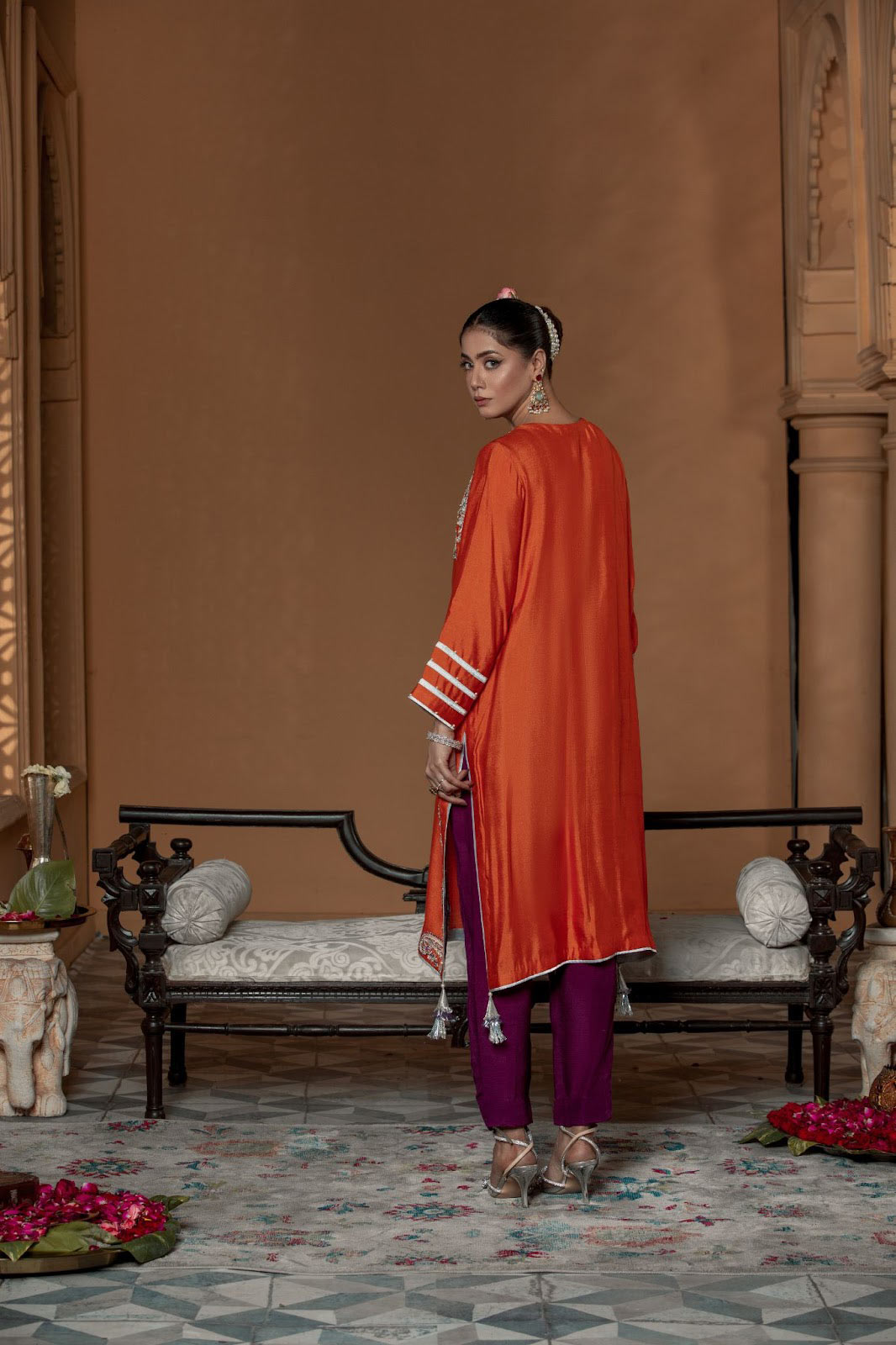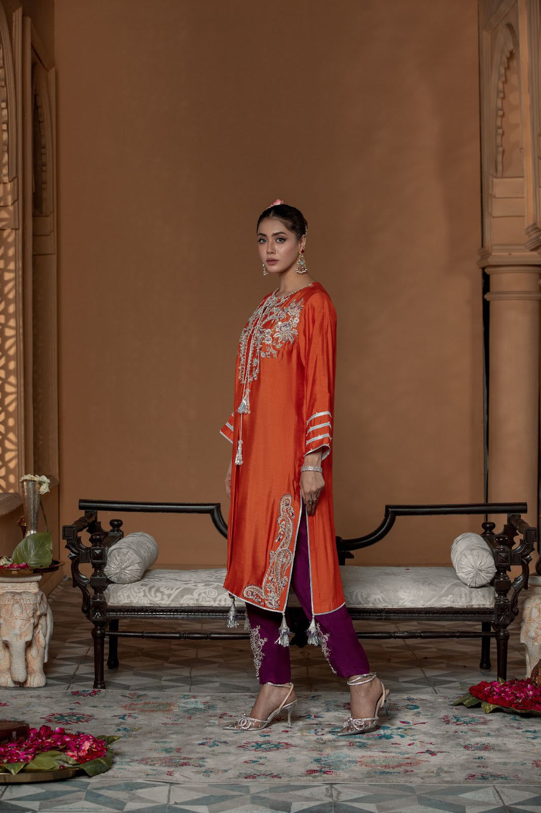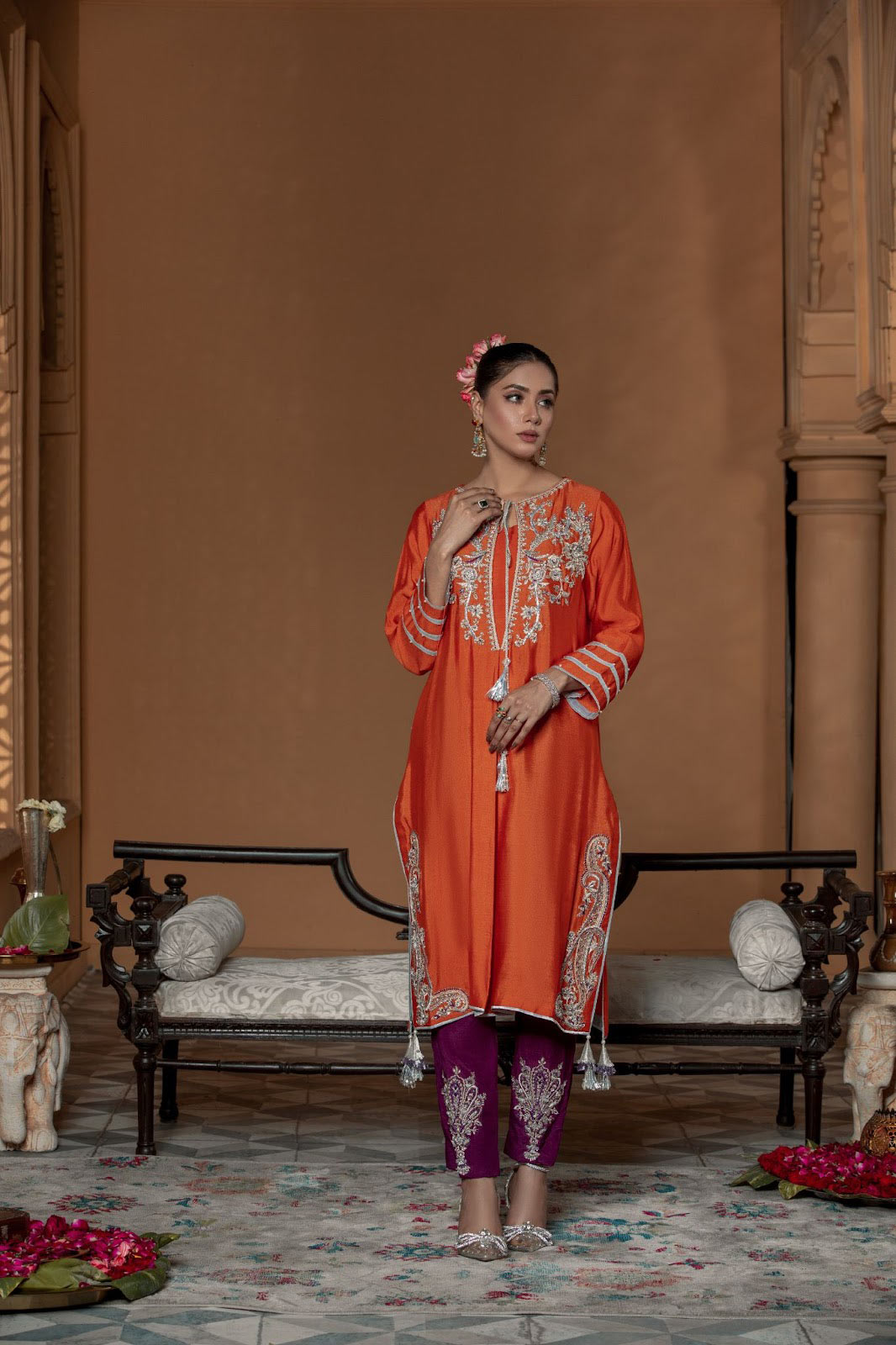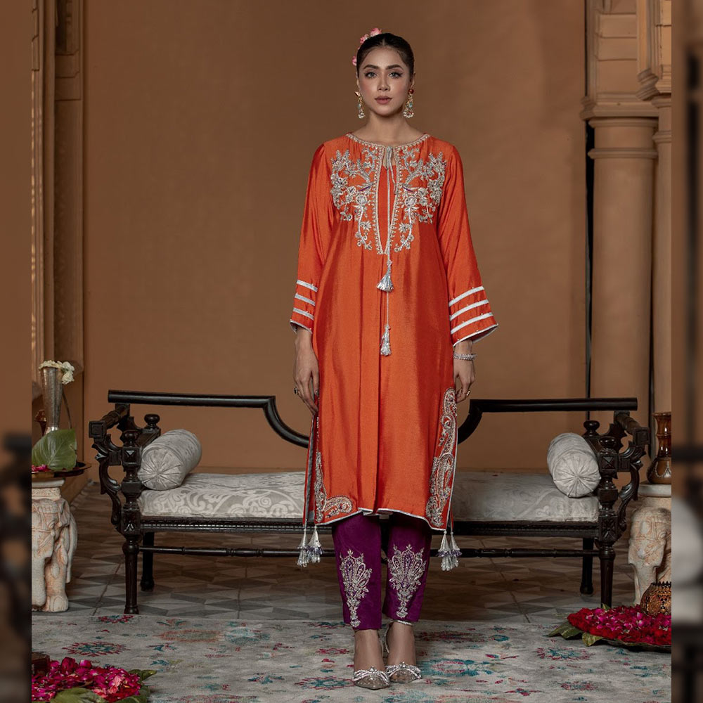 The regal tone in the company of stirring colors that will stand out in this high contrast mandarin orange and plum ensemble, a cotton net shirt hand embellished with delicate motifs along with a raw silk trouser finished with hand embellishments complimenting the shirt.
