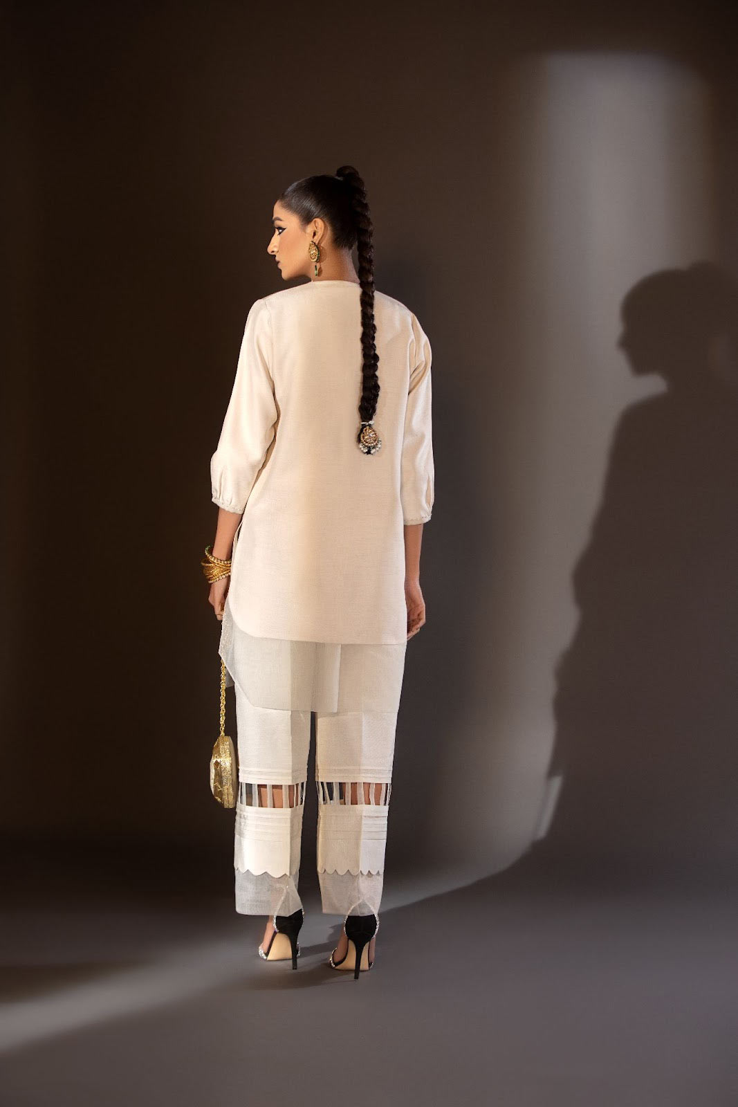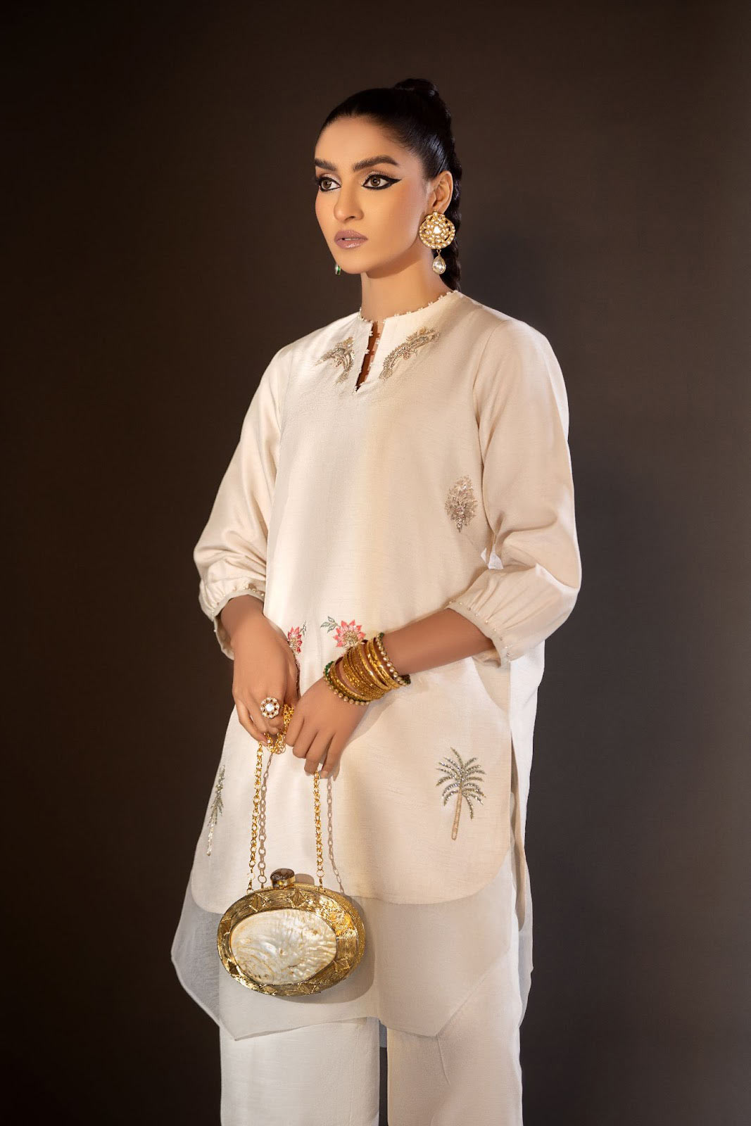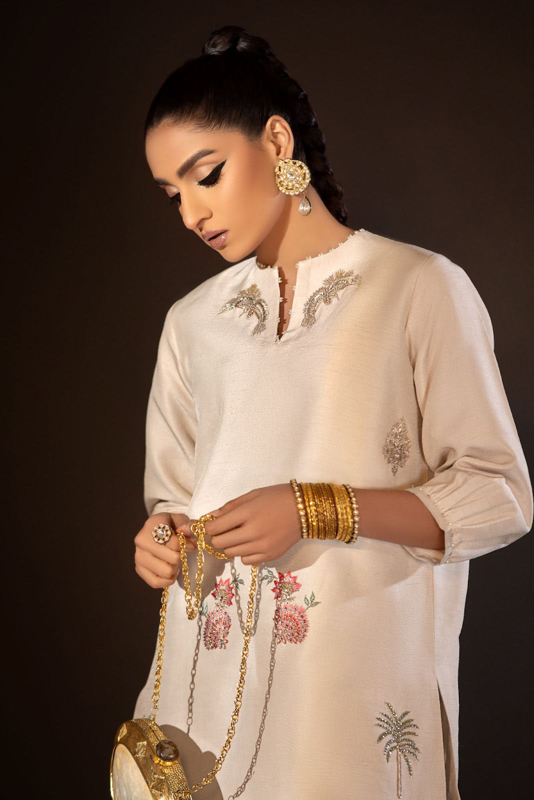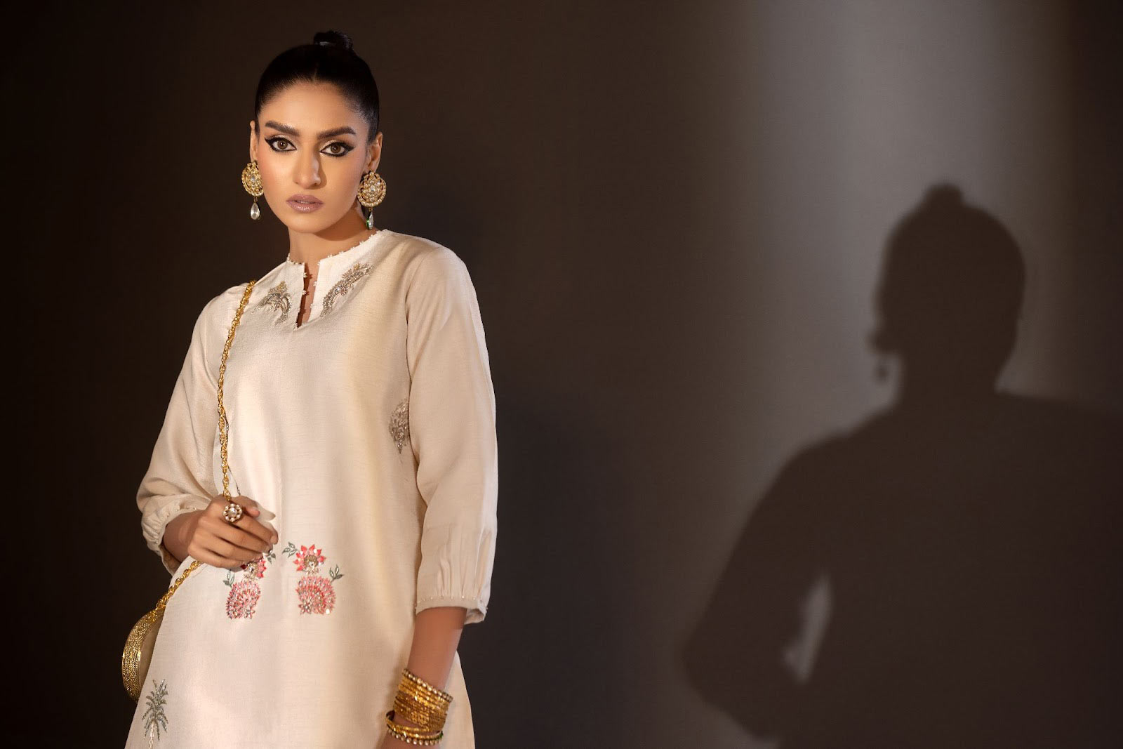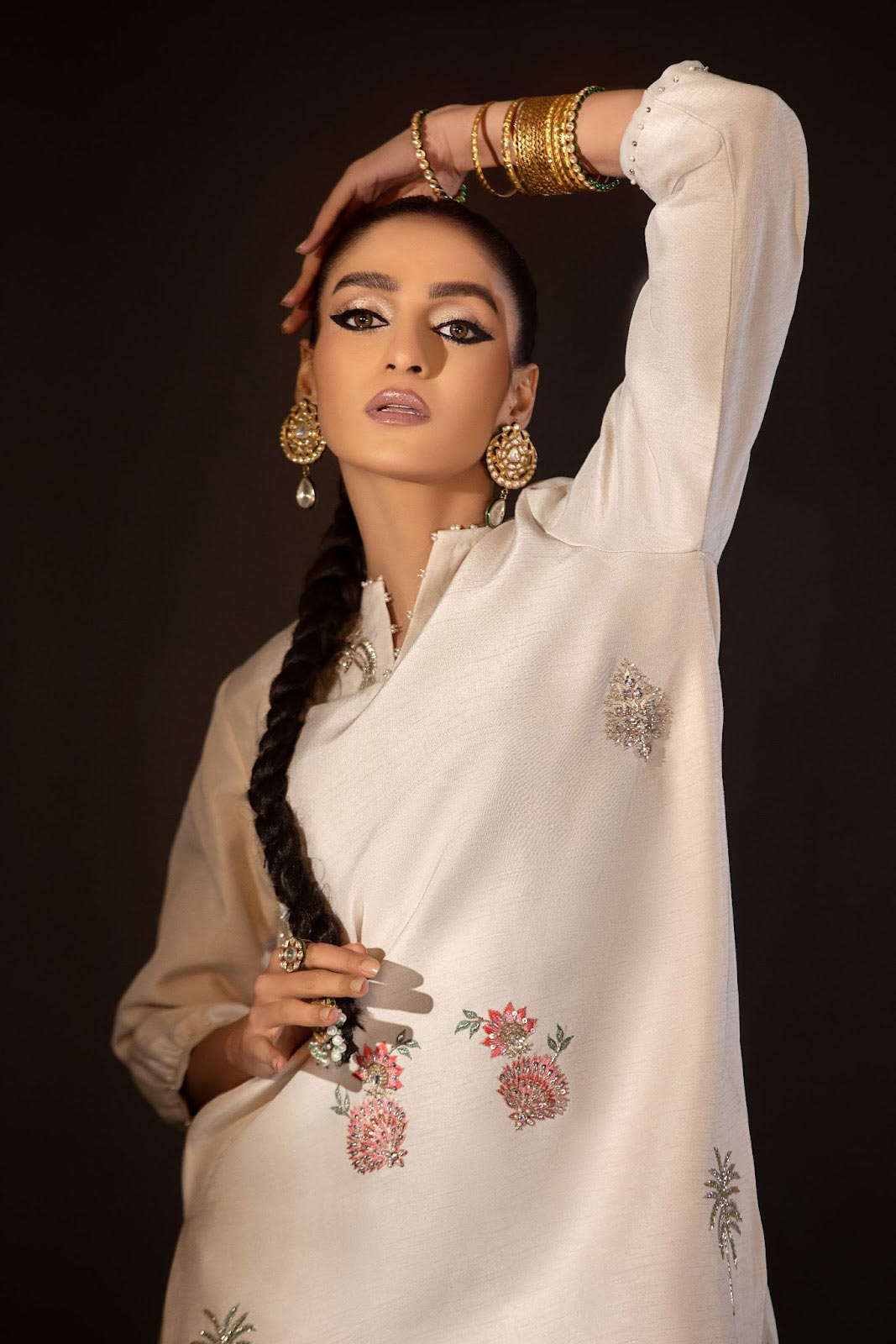 Mehtab portrays an ethereal festive persona indulged in moonlight hues detailed with intricate embroideries. A moon white raw silk shirt paired with a refined finished trouser reflecting a graceful outlook.