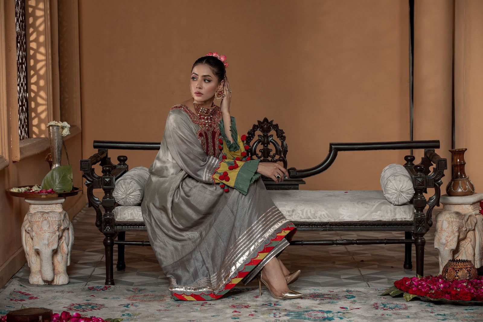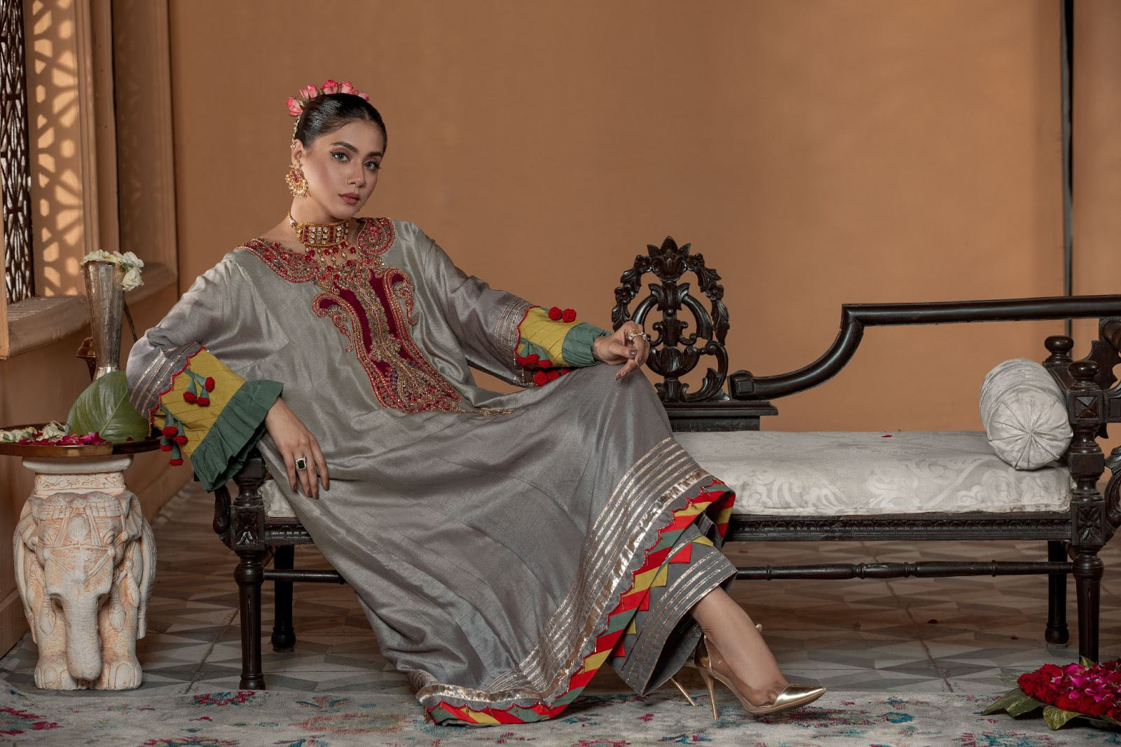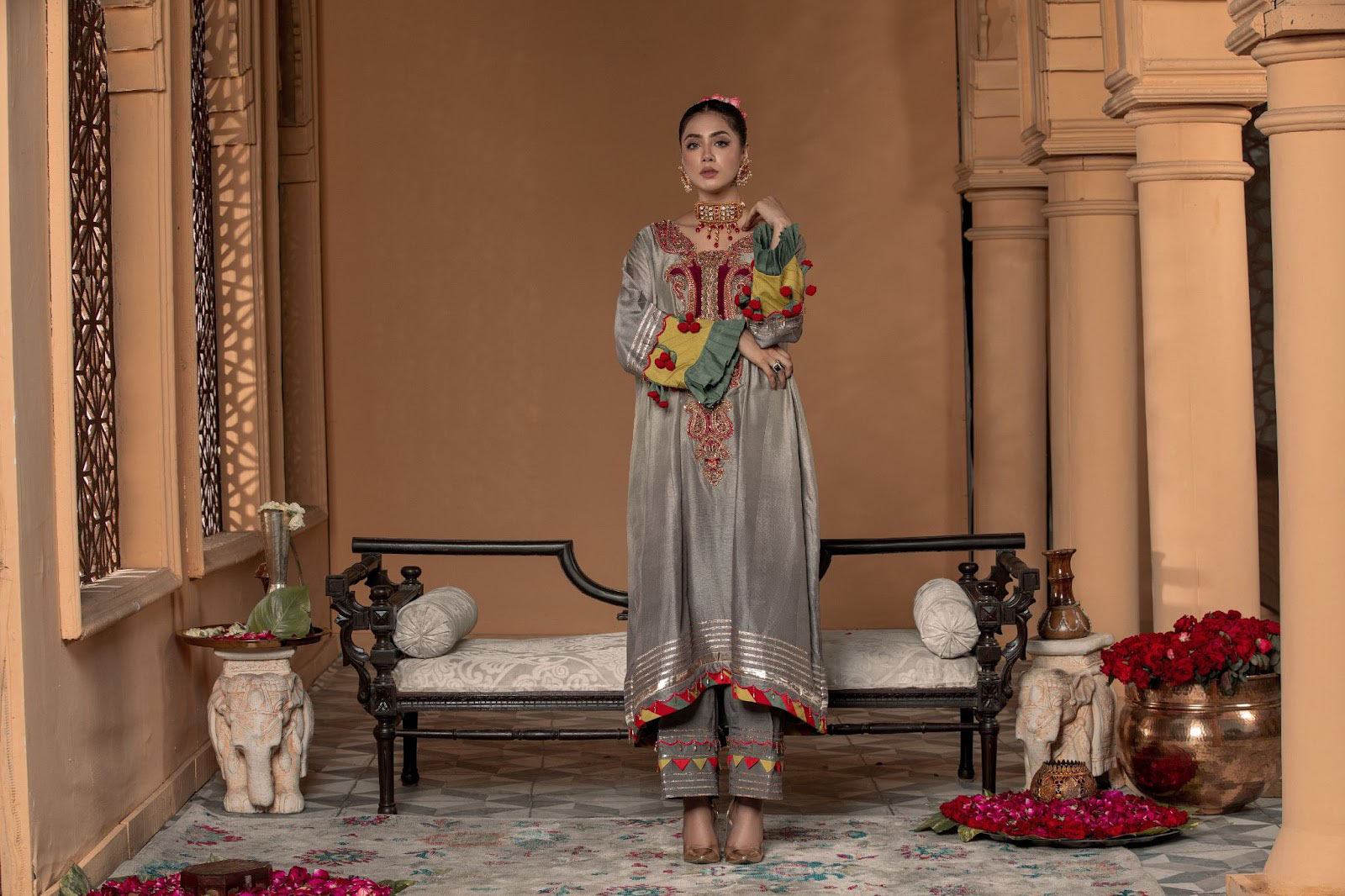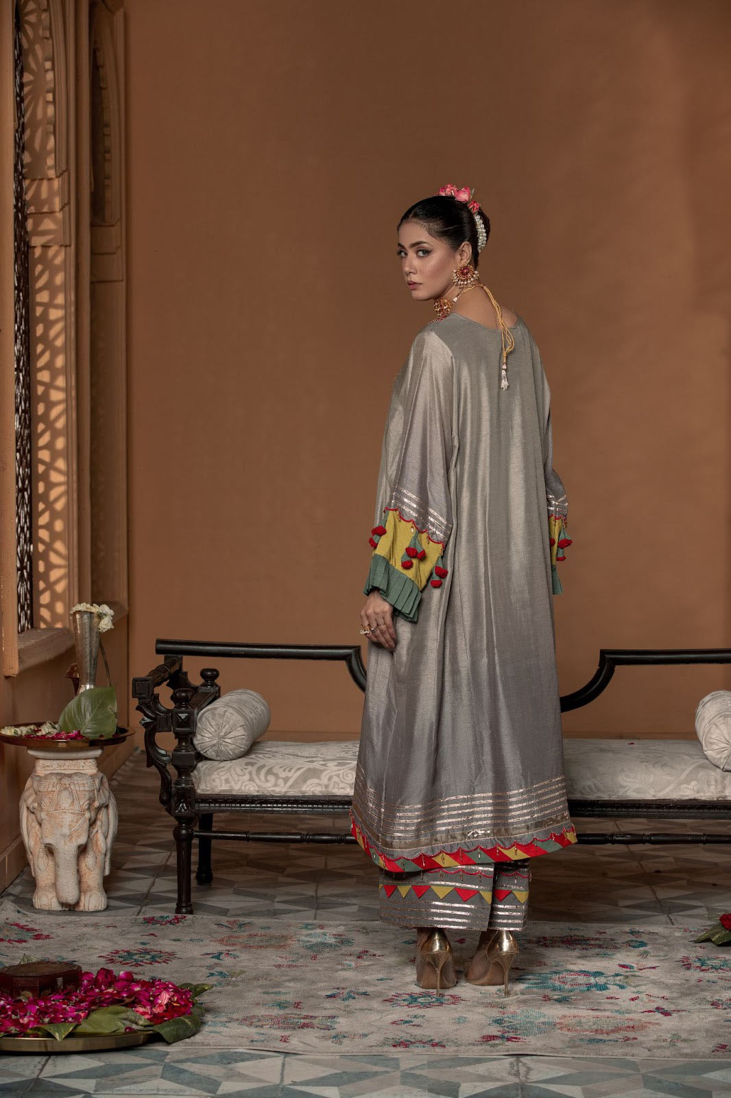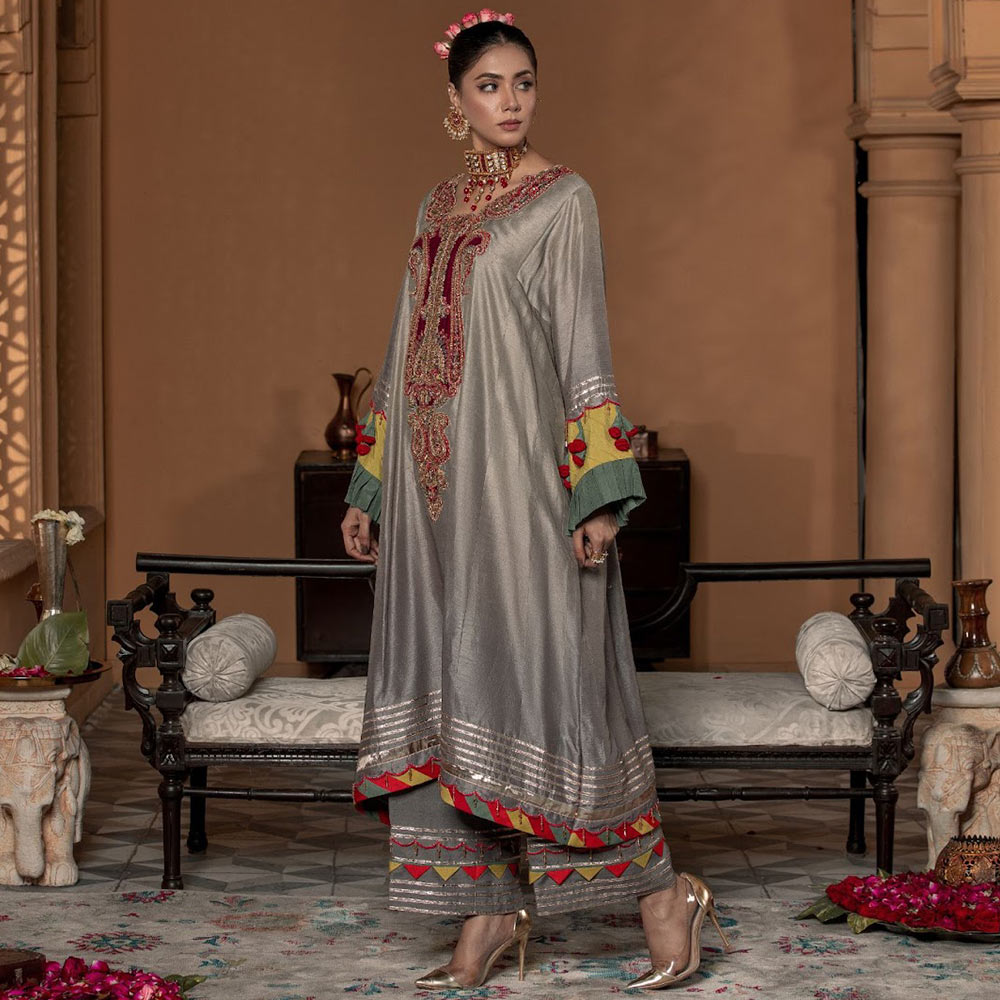 A misty gray hue dip-dyed on raw silk to play up the glamour quotient with metallic tones of silver, a melange of colors added to the neckline sleeves and trouser, hand crafted 3D flowers added to the sleeves to add to the elegance with its neatness that is pleasing ingenious.