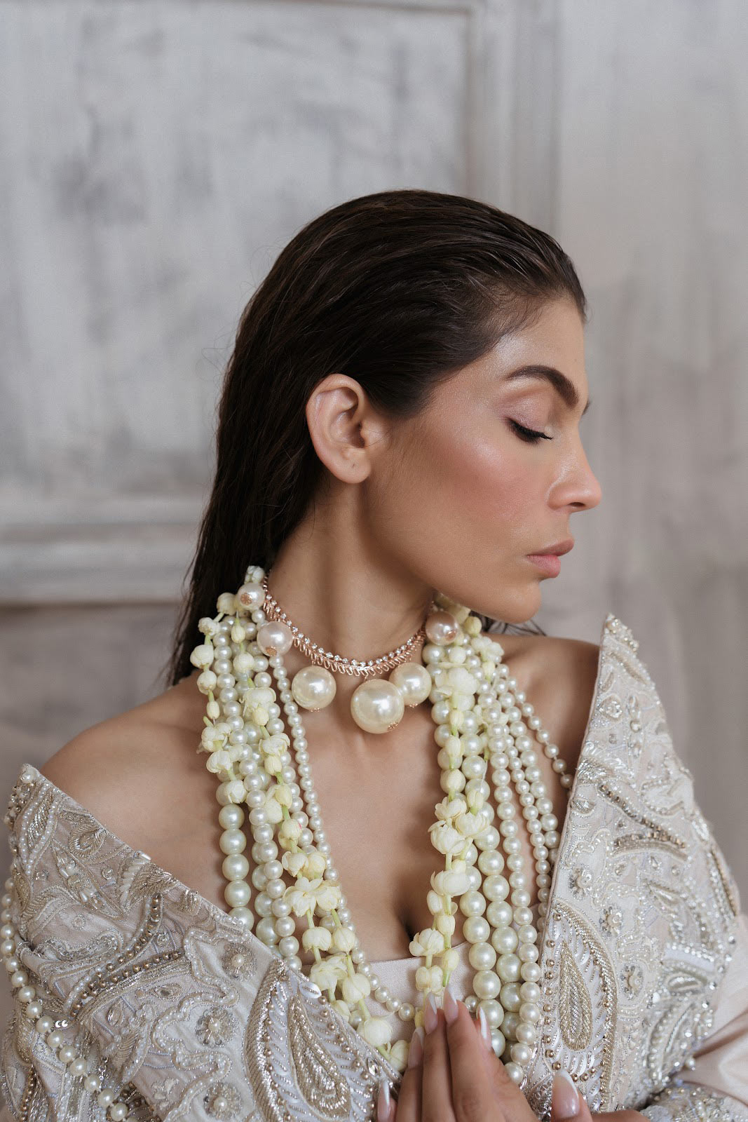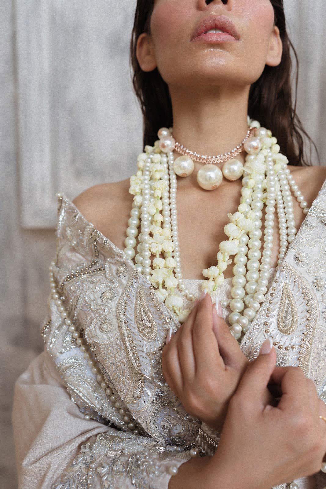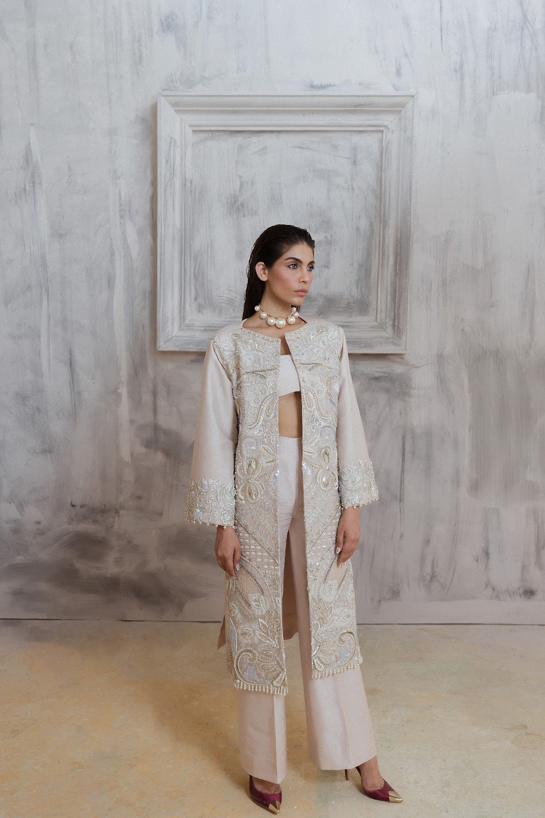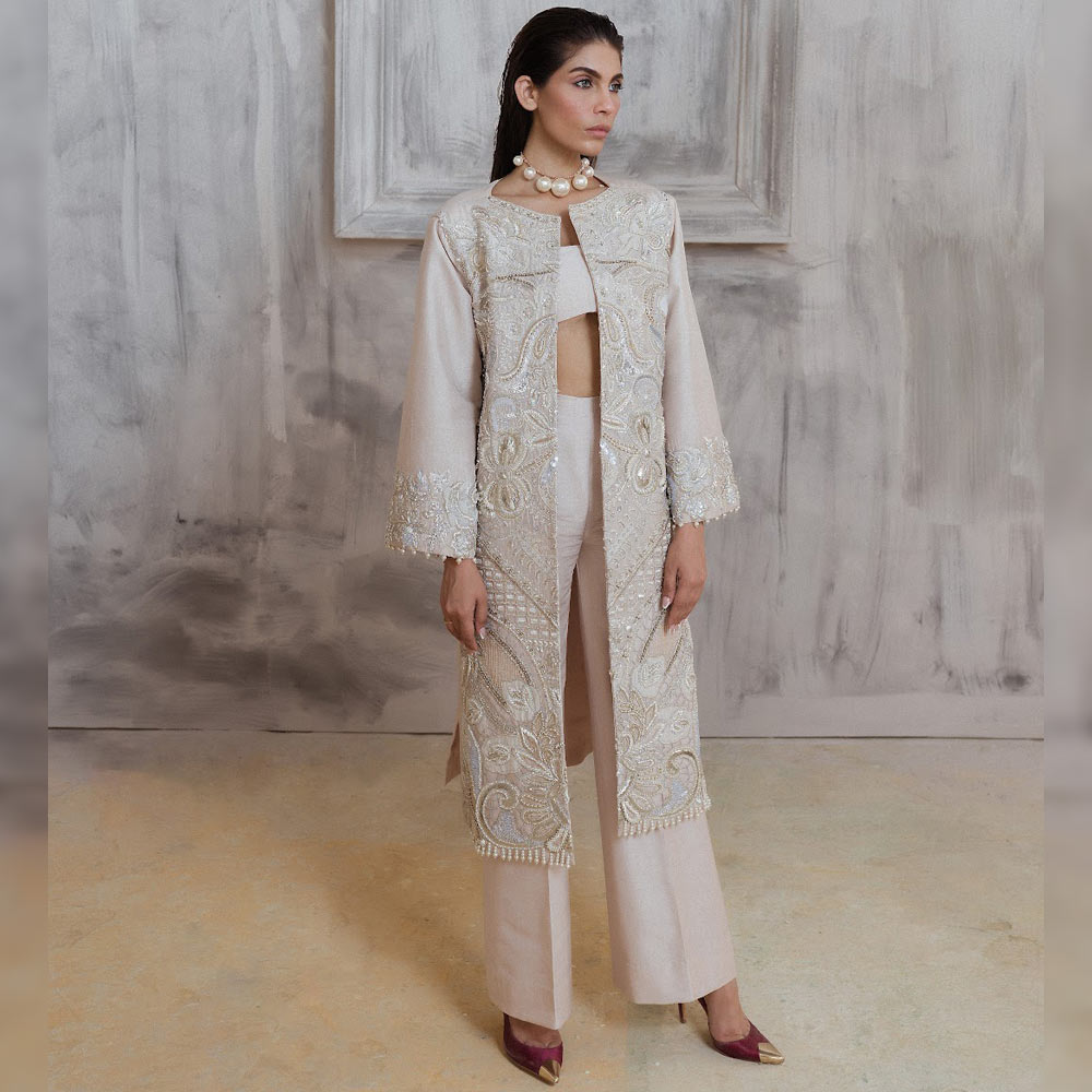 Parel is a scintillating outfit inspired from the vintage real pearl rendered with artistic and contemporary details added one the patched fabric. The exquisite silhouette shows inspiration from the vintage oversized wool jackets.
