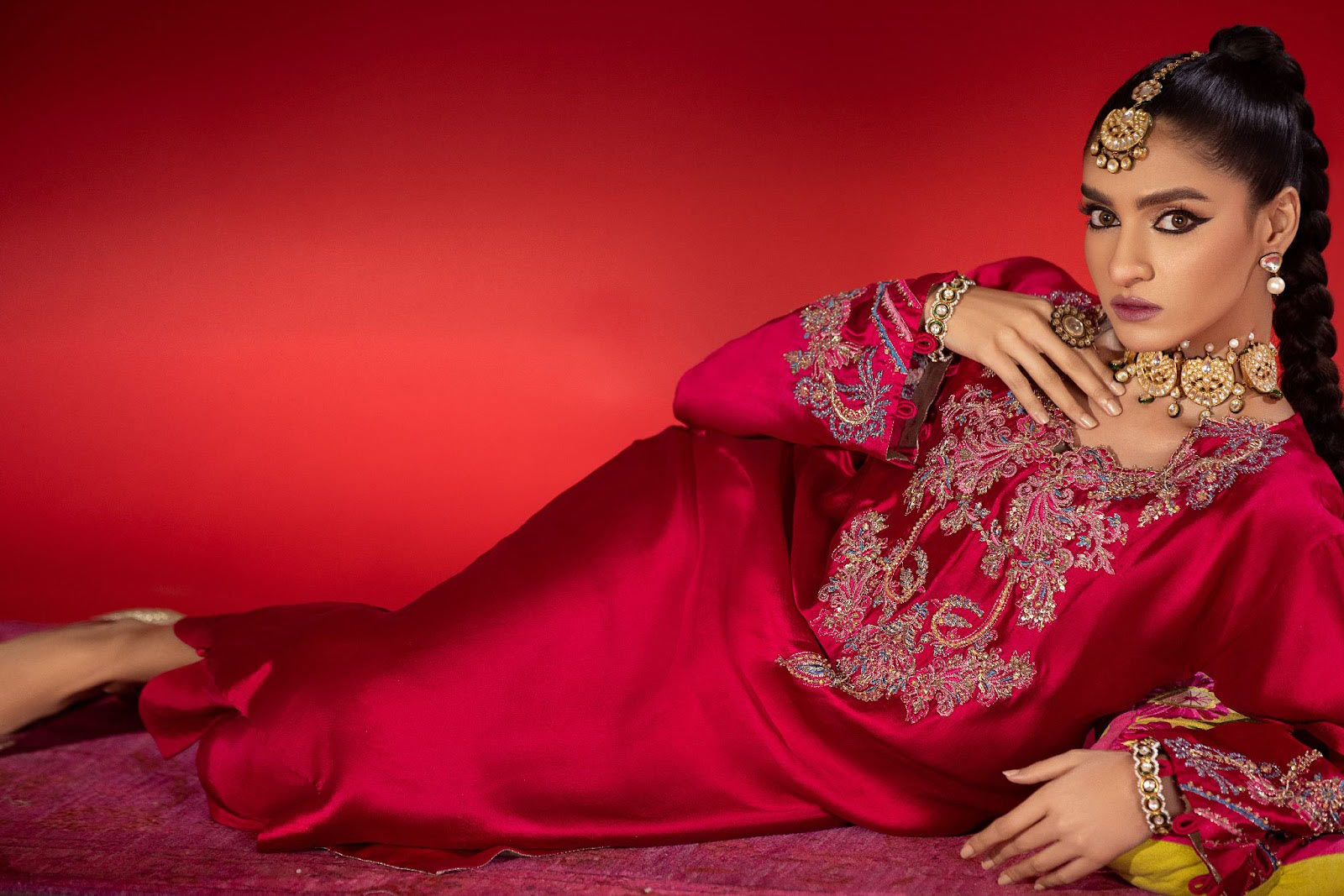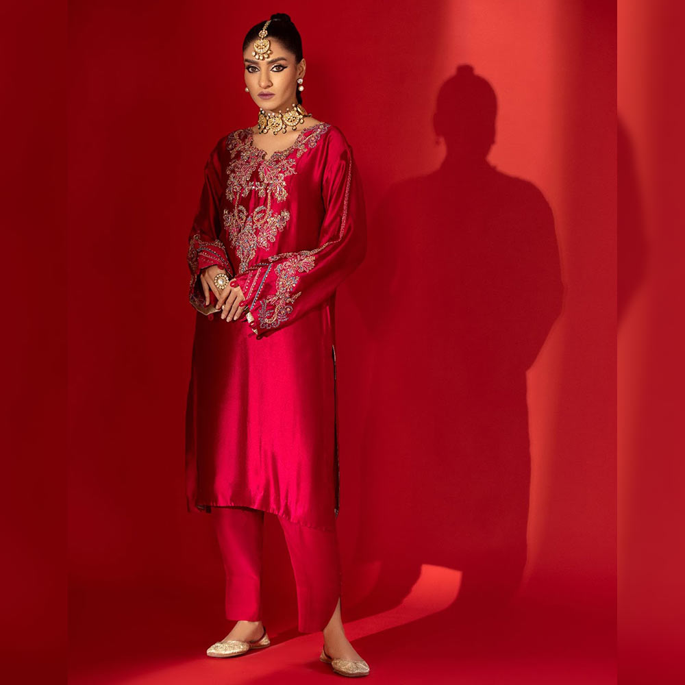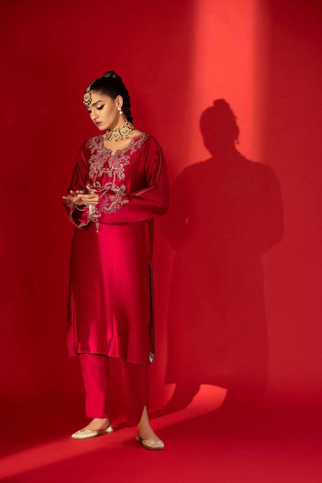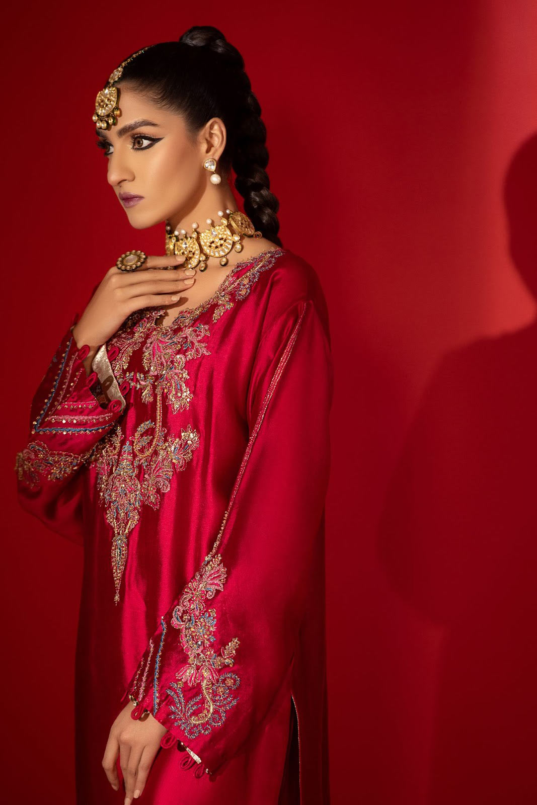 Qermez is a timelessly crafted cherry red outfit rendered with intricate details. A silk tissue shirt embelished with traditional and modern techniques and hints of gold , blue and red enhancements. A refined raw silk trouser completes the signature MOULAGE look for your festivities.