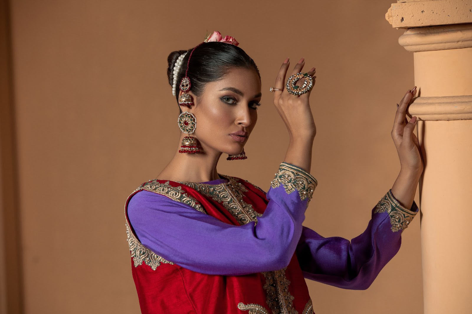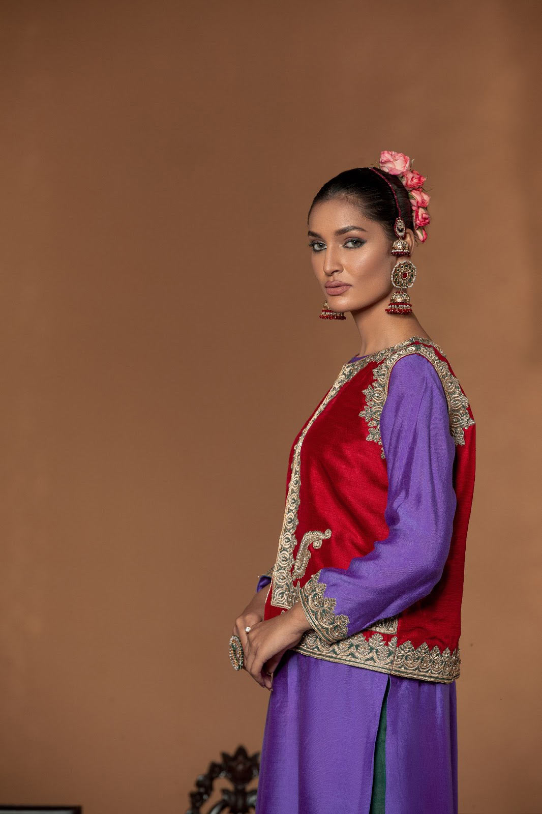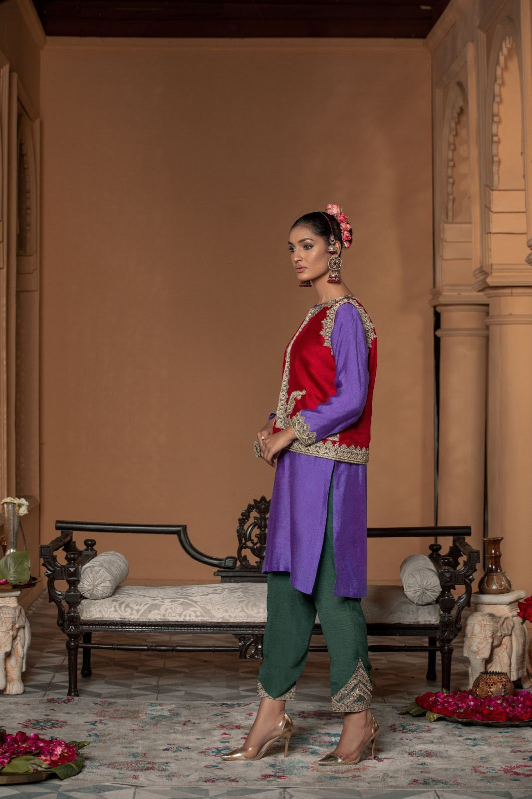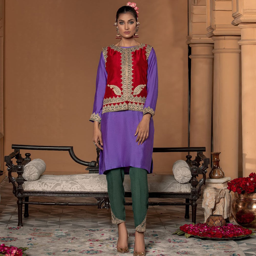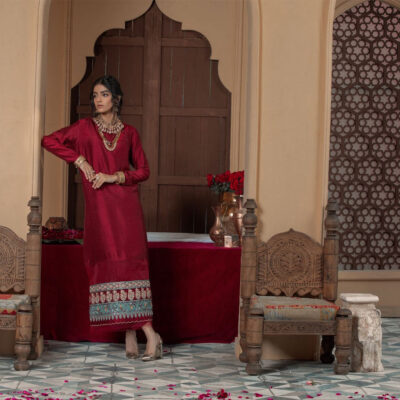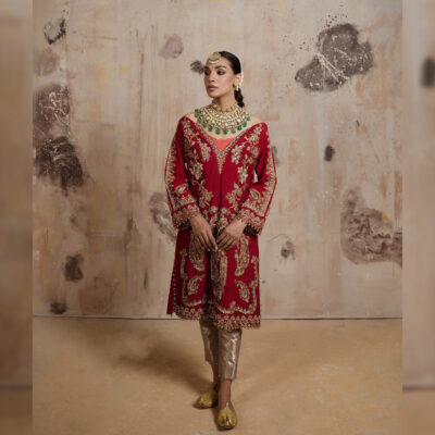 Captivating the grandeur of the bespoke waist coat an opulent silhouette, revelling in the beautiful hue of red adorned with tilla , badla and enhanced with pearls on a rich raw silk. paired with a contrasting shirt and trouser with tilla thread-work hand crafted flawlessly .