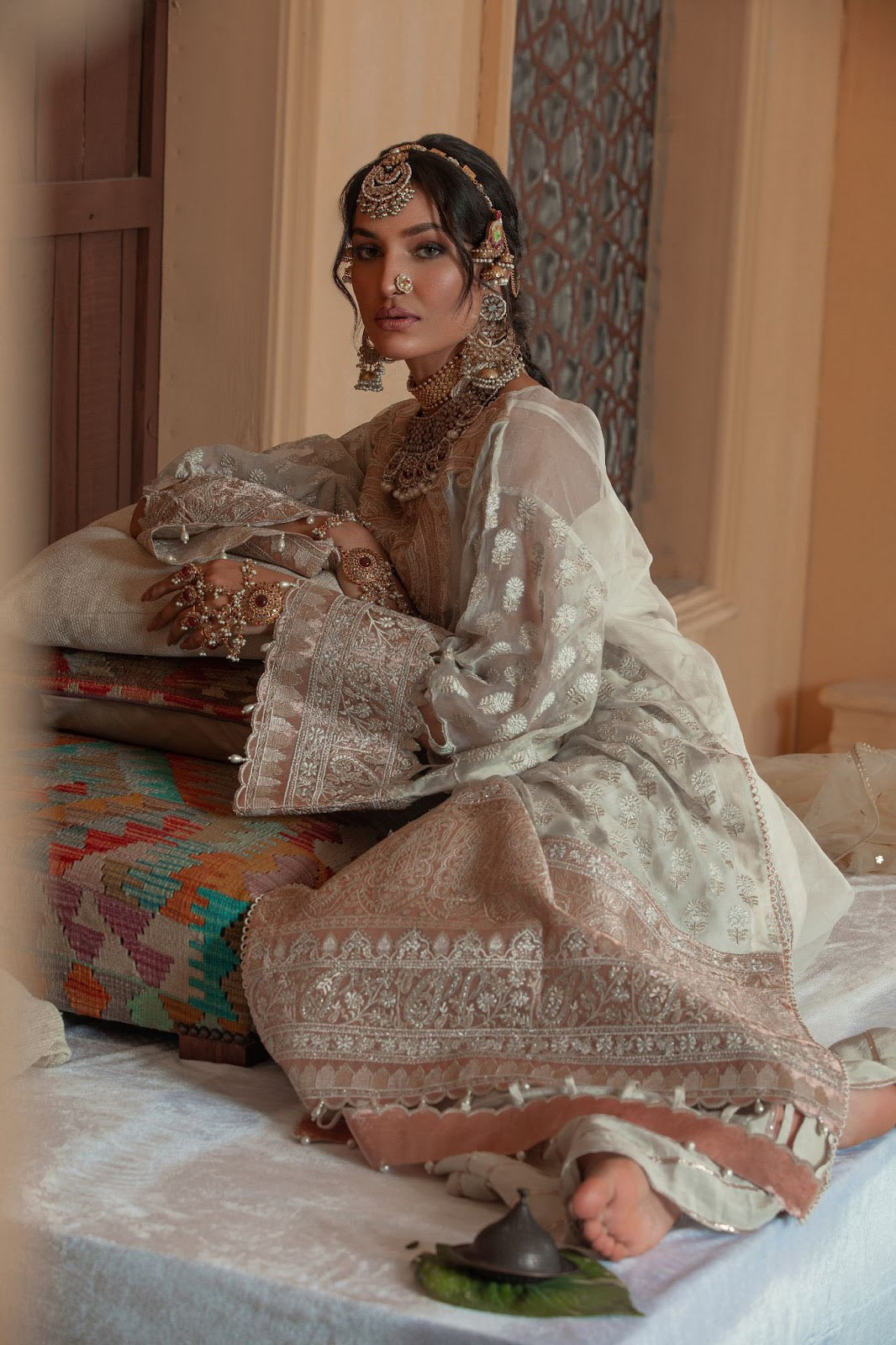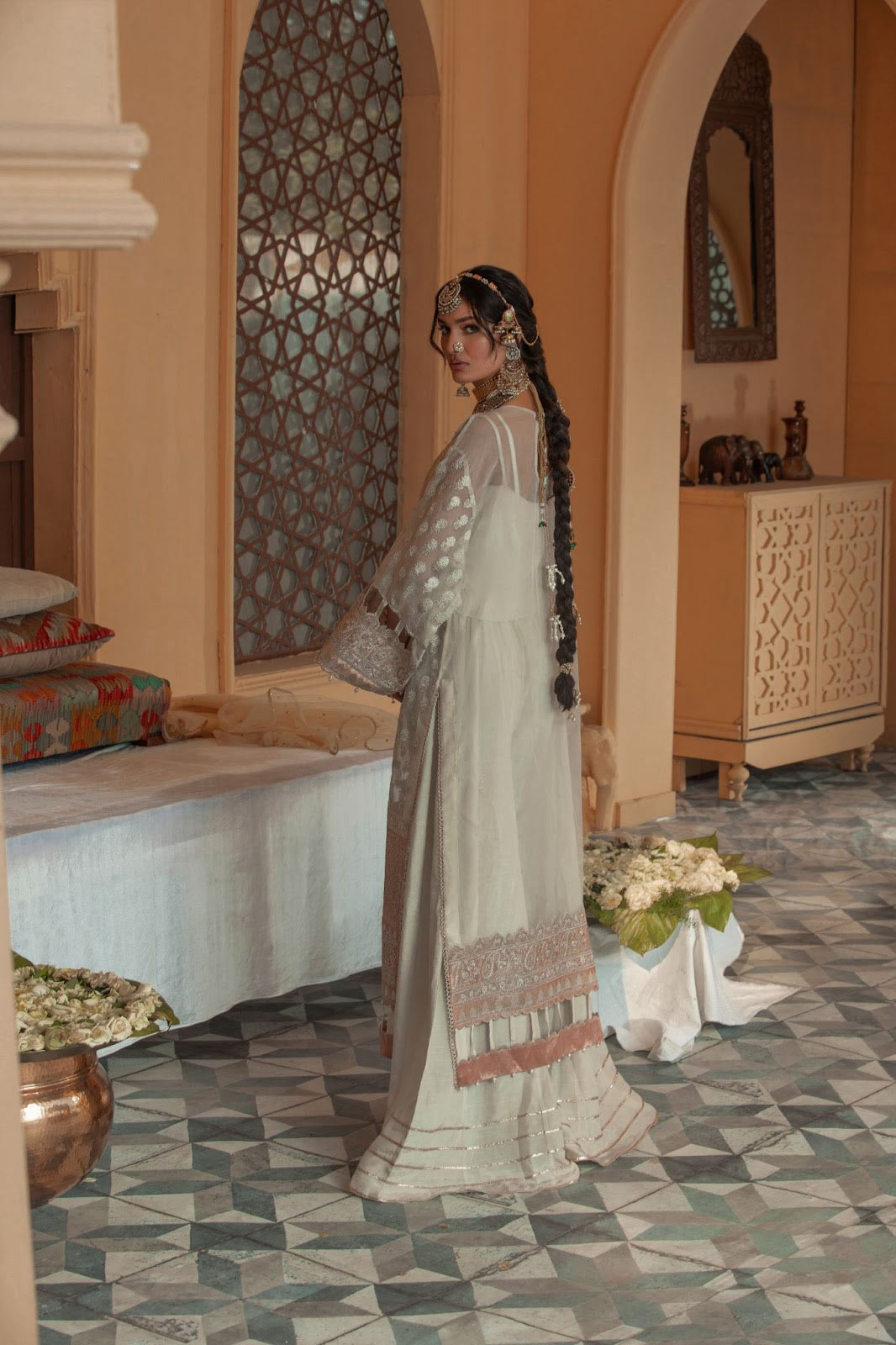 Sheer Bliss is a splendored pearl white ensemble with hints of pink enhanced with gold white embroideries inspired by a Norwich design layout. A pure organza and tissue fabric, hand-embroidered shirt paired with a graceful raw-silk sharara finished with gota.