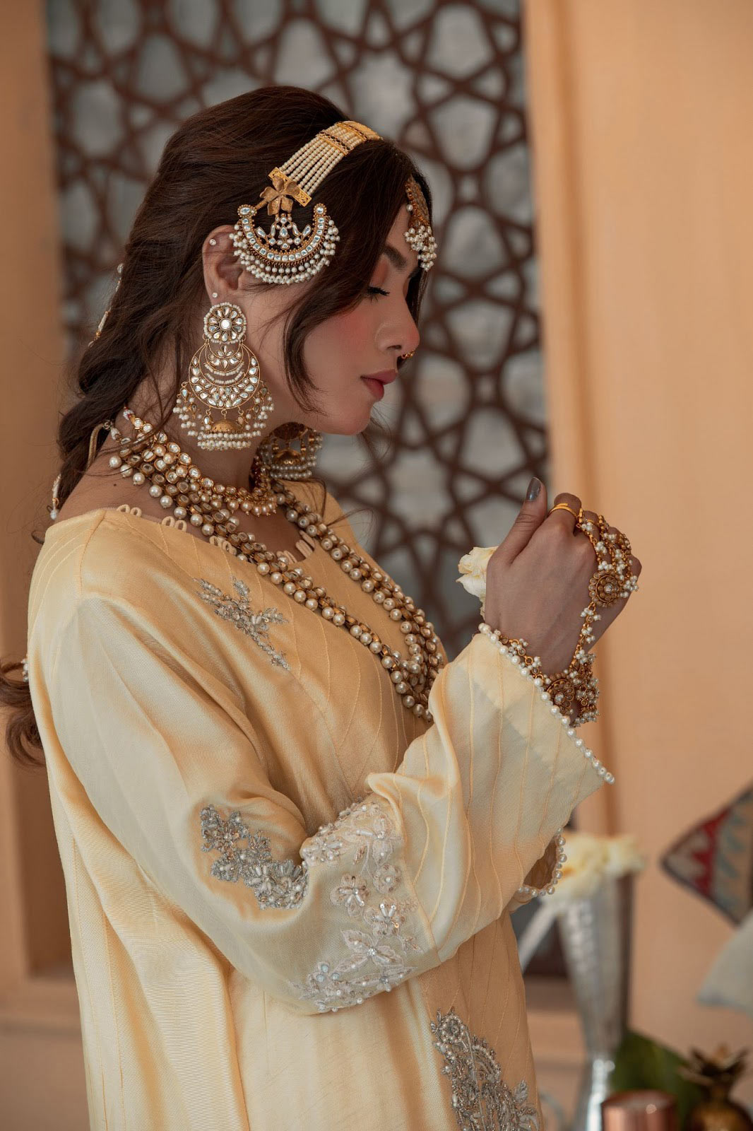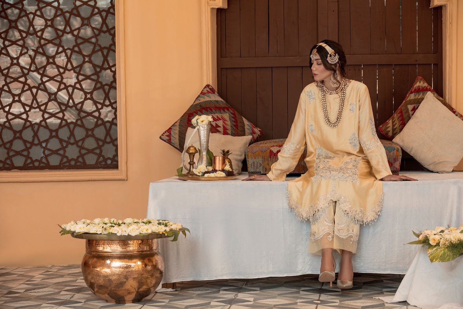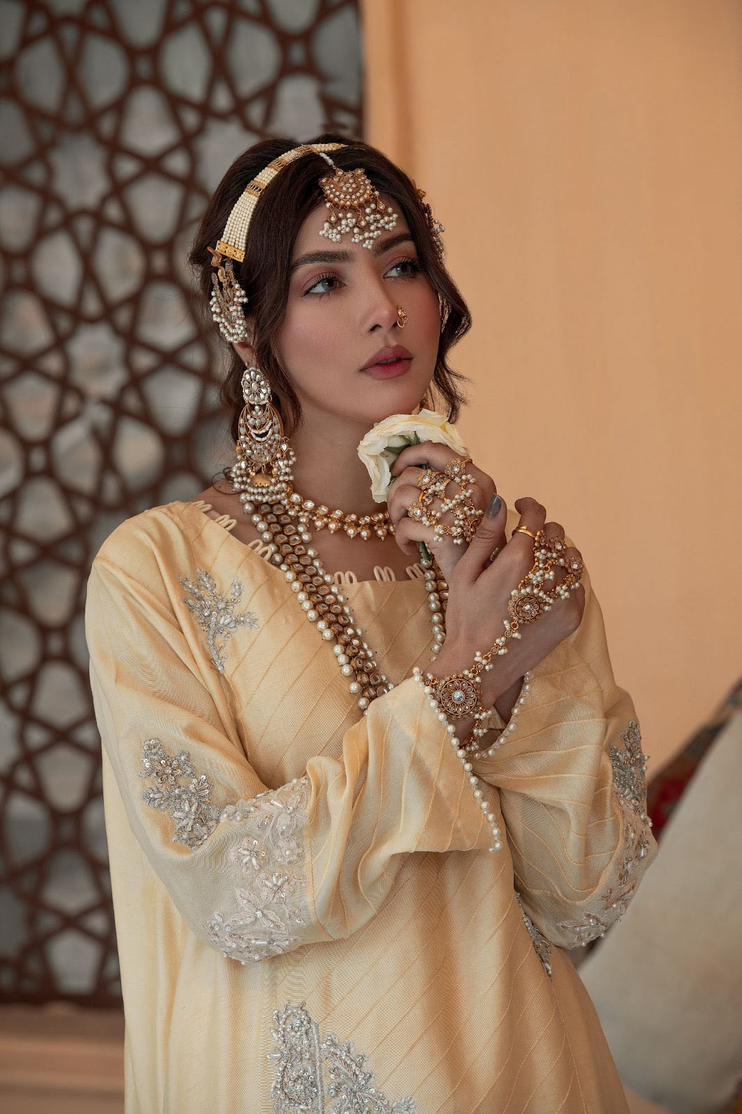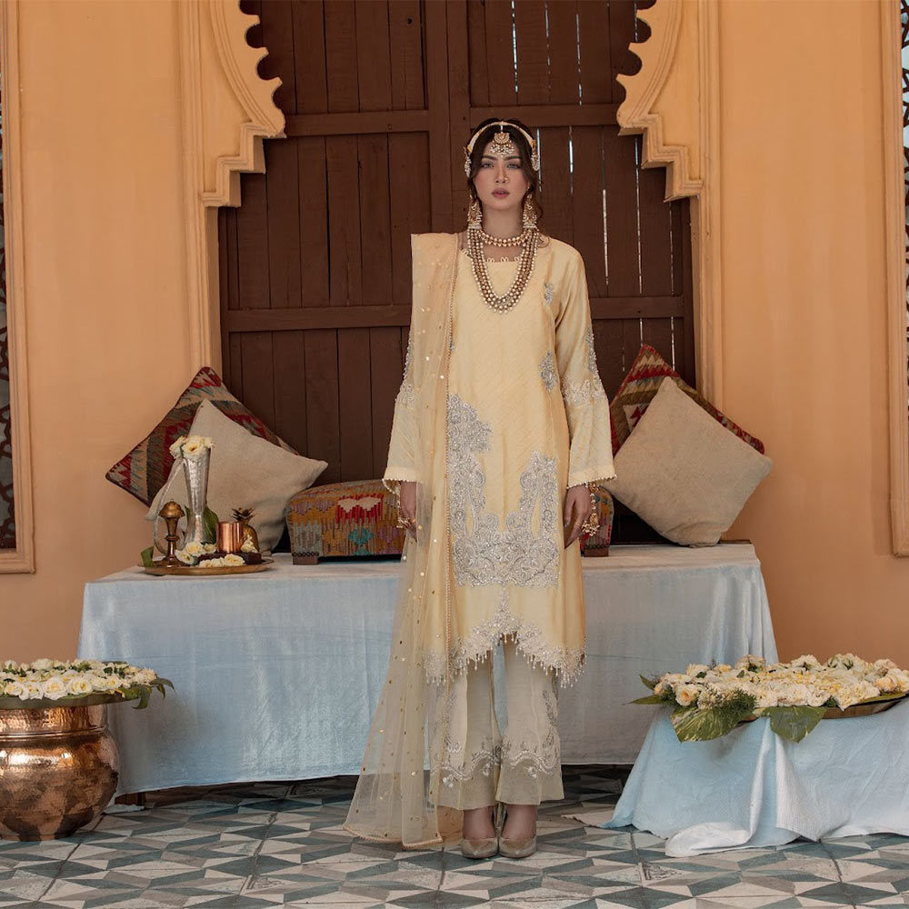 Sundress is a glistening festive outfit a very pastel lemon yellow hue rendered with intricate embroideries. A long raw silk shirt detailed with intricate work, Indian and Mughal floral motifs further enhanced with high quality hand embellishments and organza finishings. The look is completed with an embroidered trouser finished with organza details and a net mukesh dupatta.